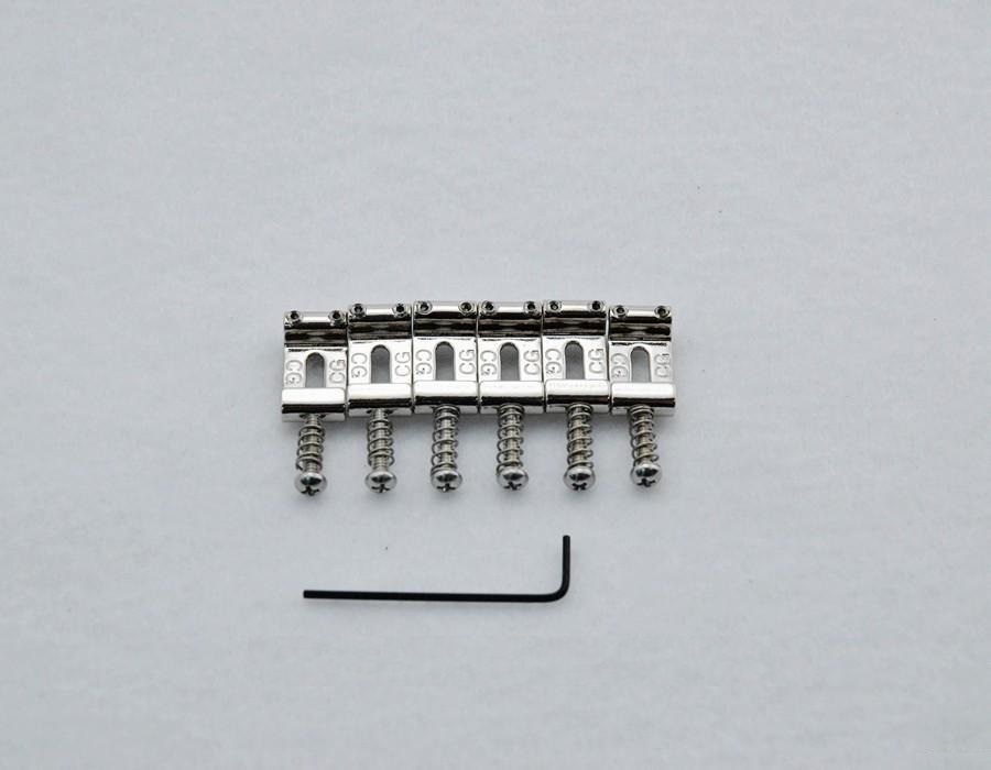 Callaham Vintage Styled Strat "CG" Saddles for 2 1/16 Spaced Bridge The same saddles and hardware we use on our V/N and Mexican bridge assemblies. In order to meet the demand for a quality saddle for the 2 1/16" Mexican Standard guitars, we offer narrower vintage styled stamped steel saddles for Mexican Standard guitars. These saddles are far superior to the Fender production saddle in every aspect. They have English 4-40 stainless steel height adjustment and intonation screws and springs. The height screws are much shorter than the factory metric screws and because they are English, they are widely available. They are supplied with 5/16" length screws for the E strings and 3/8" length for the rest. These saddles could also be used for 2 1/8" spaced bridges. Includes: