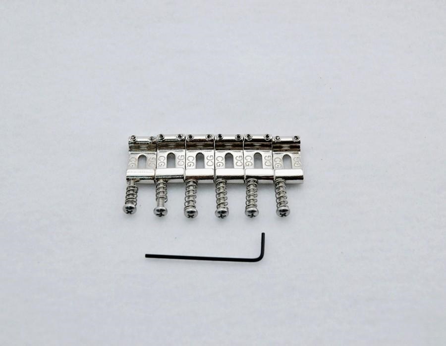 Callaham Vintage Styled "CG" American Deluxe Saddle Set In order to meet the demand for a high quality vintage styled saddle for American Deluxe guitars, we offer narrower vintage styled stamped steel saddles for American Deluxe guitars. Not only do they sound far better than the stock cast saddles, they look so much better. These saddles are specifically for American Deluxe styled bridges with the offset intonation screw. They are supplied with all stainless steel 4-40 screws. The E strings come with 1/4" length height screws and 5/16" length height screws for the others. Includes: