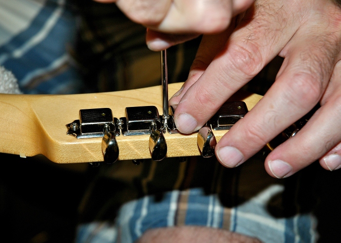 Many like the look and function of vintage tuners over a Schaller style tuner for their instrument. To us, the neatness of the slotted string post is an advantage. Here is an outline of how to change to vintage style tuners. The procedures are good for any number of guitars. |