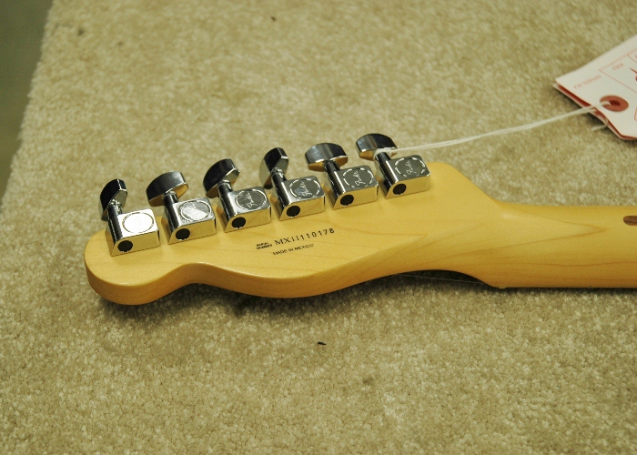 We started with a Mexican Standard Telecaster. Use a 10mm wrench or socket to remove the bushings, and remove the tuners. |