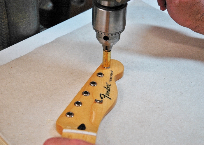 To change to vintage tuners, you must use conversion bushings. They are sized for a 10mm (.394) hole. This is how a small shop could do the install with a drill press. A brass "pusher" is placed in the chuck and the quill can now be used as a ram. A felt lined board is placed under the neck and the bushings are pushed home. Very little force is required and gravity does not work against you. Avoid using a hammer. |