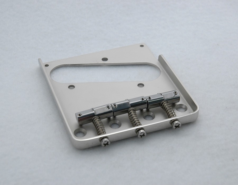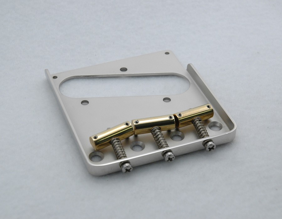 Note: This bridge will do for a Tele what our strat bridge does for strats. It will increase sustain, volume, and eliminate unwanted feedback problems associated with the standard vintage Fender bridge. Most bridges are made from .045 - .050 inch thick 1010 steel that is soft and easy to form into the "tray shape". Those bridges have poor sustain and tend to cause feedback problems. Some use brass castings for their saddles. Our bridge is made from .075 inch thick 1018 specially treated steel. This gives the plate an 80% increase in rigidity and dramatically improves sustain, volume, and note separation. It eliminates unwanted feedback. There is a noticeable increase in bass response and a taming of harsh high end. The first 3/4 inch of the front lip is removed to allow for best right hand picking. Coupled with our machined compensated saddles makes this bridge the best available for any vintage styled Tele.